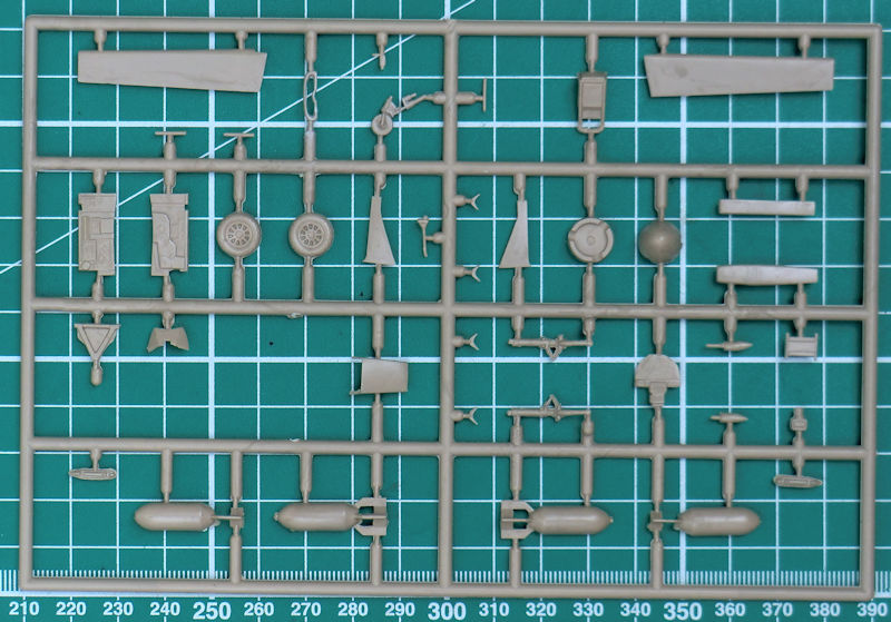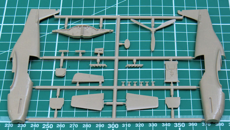 Die Luftschraube ist einteilig. Das einzige Resinteil ist für den großen Lufteinlauf unterm Rumpf. Ruder und Landeklappen haben scharfe Hinterkanten. Leider sind die einzigen Fotoätzteile sind für die Sturzflugbremsen. Das Fahrwerk sieht ordentlich aus und die Klappen haben von innen auch schöne Strukturen. Die inneren Klappen sind am Boden verschlossen. Leider gibt es hier nur eine einteilige Kanzel. Diese ist aber dünn und schön durchsichtig.