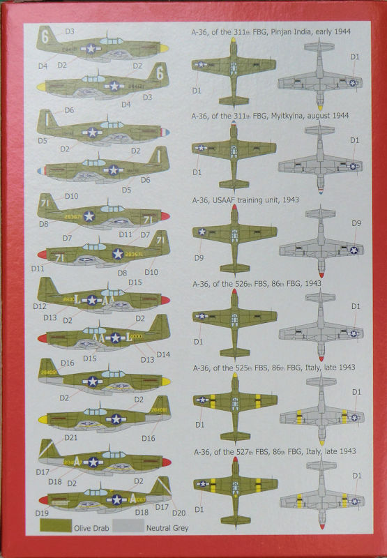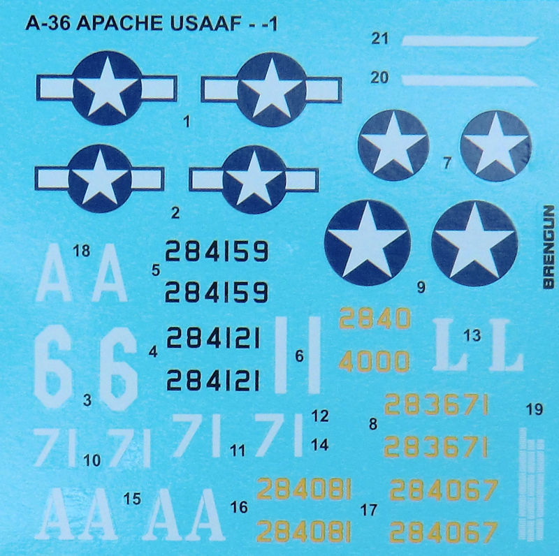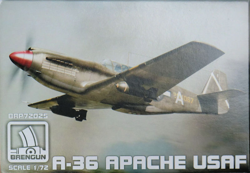 Bausatz: Kürzlich überraschte Brengun aus Tschechien mit einer A-36 Apache in 1/72. Diese wird in zwei Verpackungen angeboten. Einmal gibt es den Bausatz als USAF(! eigentlich USAAF) und als RAF Variante. Der Unterschied liegt nur in den Decals. Zuvor gab es in 1/72 die A-36 nur als Bausatz von Condor/special hobby.
