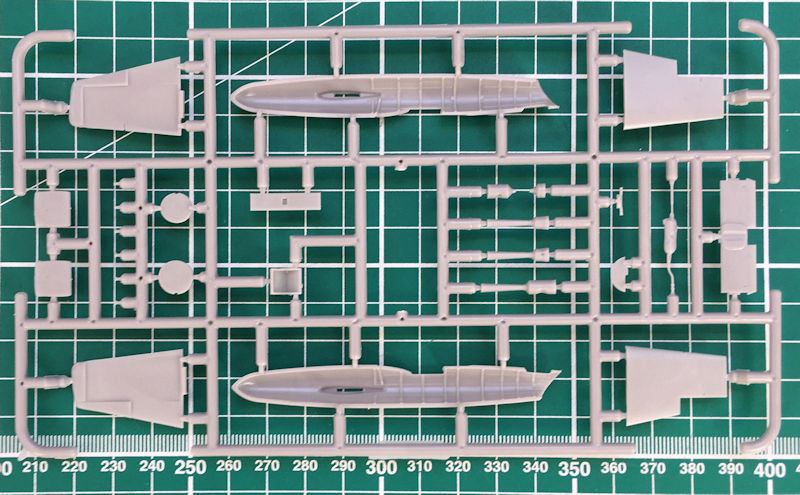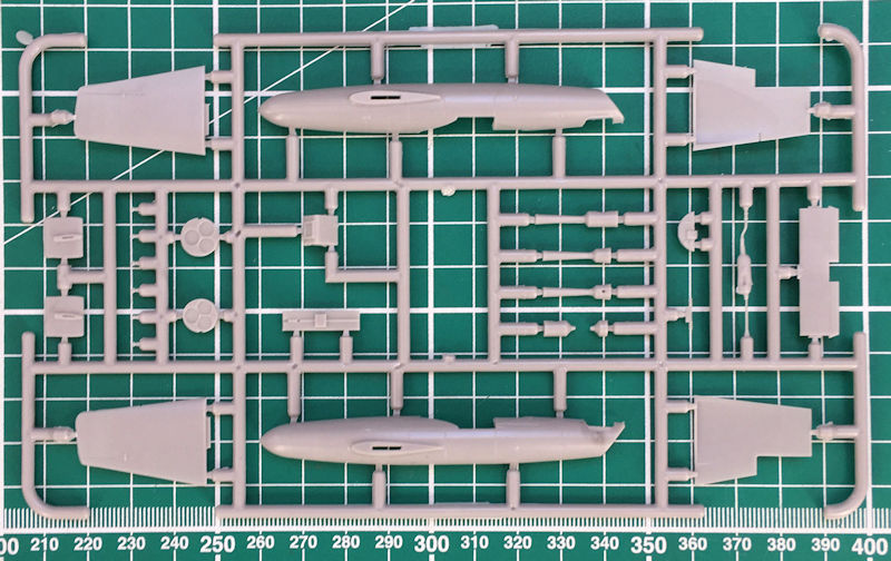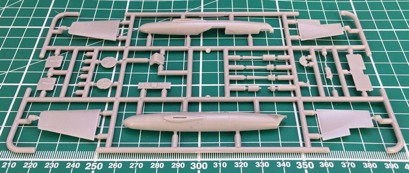 In der attraktiven aber unpraktischen Schüttbox befinden sich gut verpackt ein grauer Spritzgussrahmen mit 27 Einzelteilen, ein Klarsichtteil, elf Resinteile ein Decalbogen und die übersichtliche Bauanleitung. Die Bauteile sehen recht gut aus. Es gibt einige Sinkstellen bei den Triebwerksteilen die im Innern der Ohka verbaut werden sollen. Das Cockpit war auch im Original etwas spartanisch ausgestattet. Hier gibt es nur fünf Teile zu verbauen. Aber Brengun hat ja noch ein Fotoätzteilset im Angebot. Dort gibt es auch die passenden Sitzgurte. Die Rumpfinnenseiten sind aber schön detailliert.