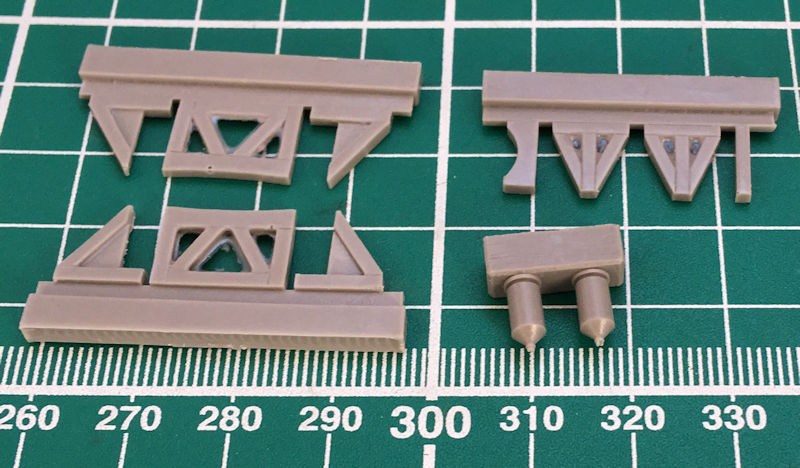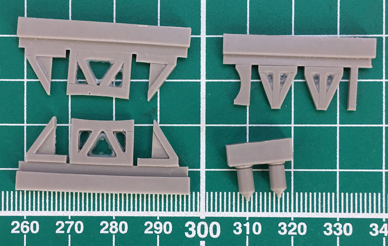 Ansonsten gibt es außen nicht viele Teile zu verbauen. Die Tragfläche entsteht aus vier Teilen und die Querruder haben scharfe Hinterkanten. Diese findet man auch beim Höhenleitwerk sowie den Seitenrudern. Mit der einteiligen Kanzel wird das Cockpit verschlossen. Als Präsentationsmöglichkeit dienen die drei Böcke, Diese entstehen aus den elf Resinteilen.
