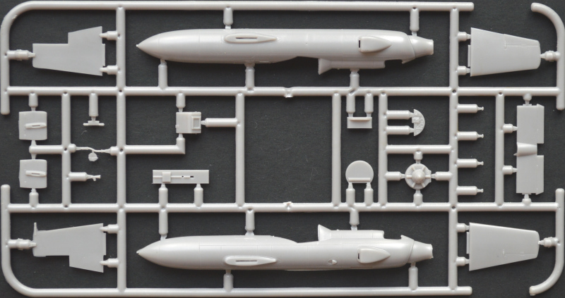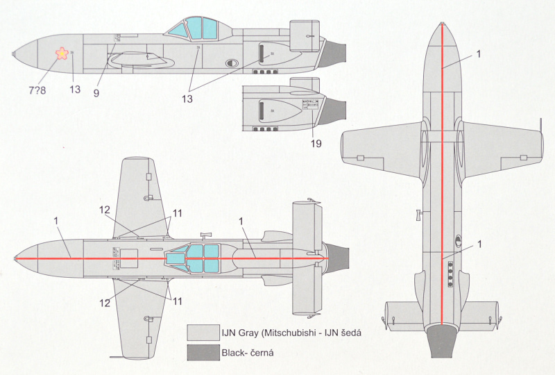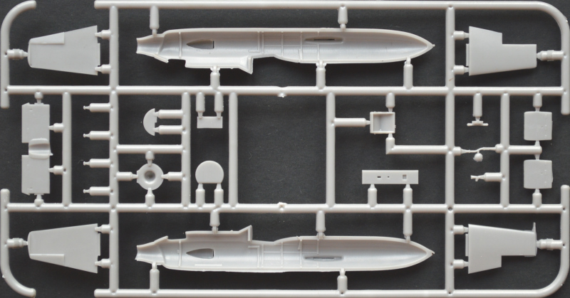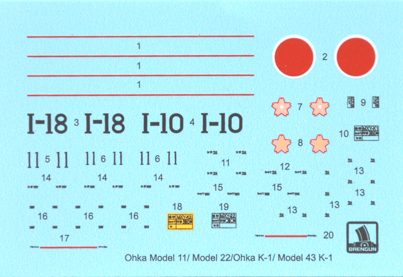 Bausatz: Die tschechische Firma Brengun hat in 1:72 mehrere Ohka-Modelle herausgebracht. Das hier vorliegende Modell 22 kommt in einem kleinen, attraktiven Faltkarton daher. Enthalten ist ein Spritzling mit 18 Teilen aus grauem Plastik, eine Klarsichthaube, 11 Resinteile, ein Decalbogen und die Bauanleitung. Der Guss der Plastikteile ist bis auf minimale Fischhäute tadellos; die Resinteile weisen daneben noch kleine Lufteinschlüsse auf, die insbesondere bei den Auslässen einiges an Nacharbeit erfordern.