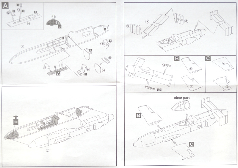 Die Bauanleitung ist kurzgehalten, zeigt aber alle Schritte genau an. Als Bemalungsanleitung dient lediglich die Rückseite des Kartons, wobei auch nur eine nicht näher genannte Bemalung abgebildet ist. Ich vermute, es handelt sich um das noch existierende Exemplar aus dem im Steven F. Udvar-Hazy Center. Der für alle Ohka-Modelle ausgelegte Decalbogen ist sauber gedruckt, lediglich bei den Hoheitszeichen gibt es einen minimalen Versatz. Positiv hervorzuheben sind die Wartungshinweise.