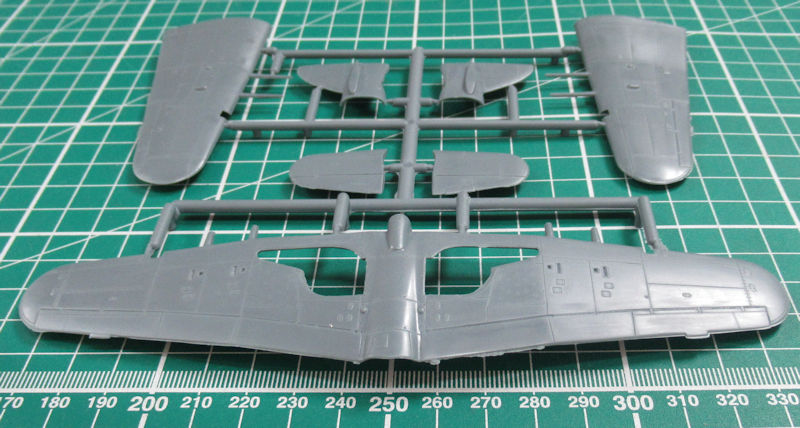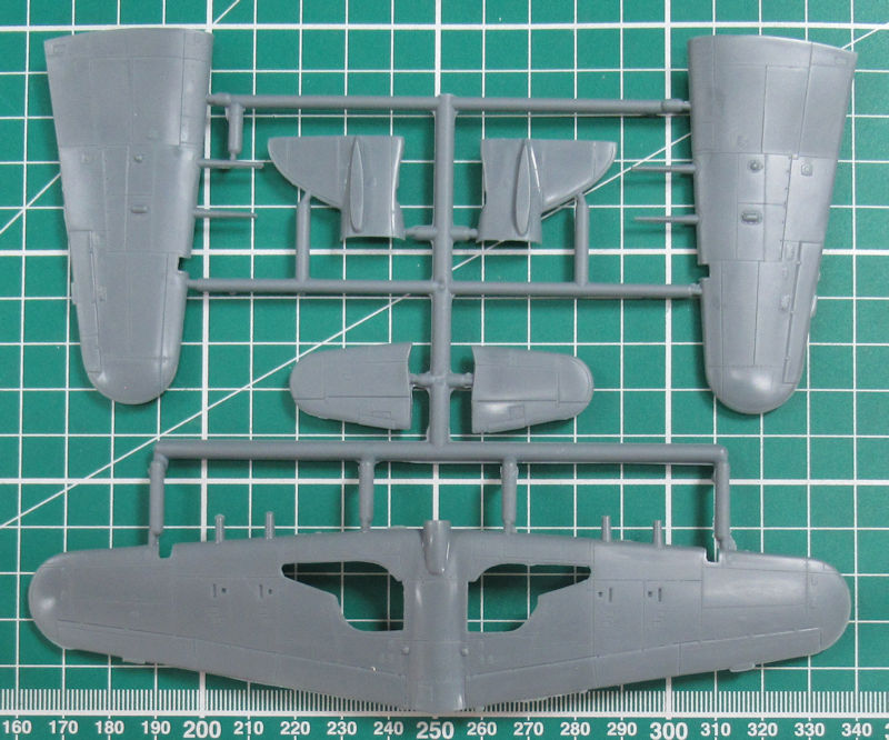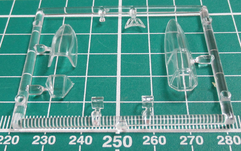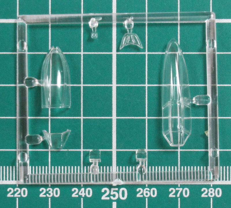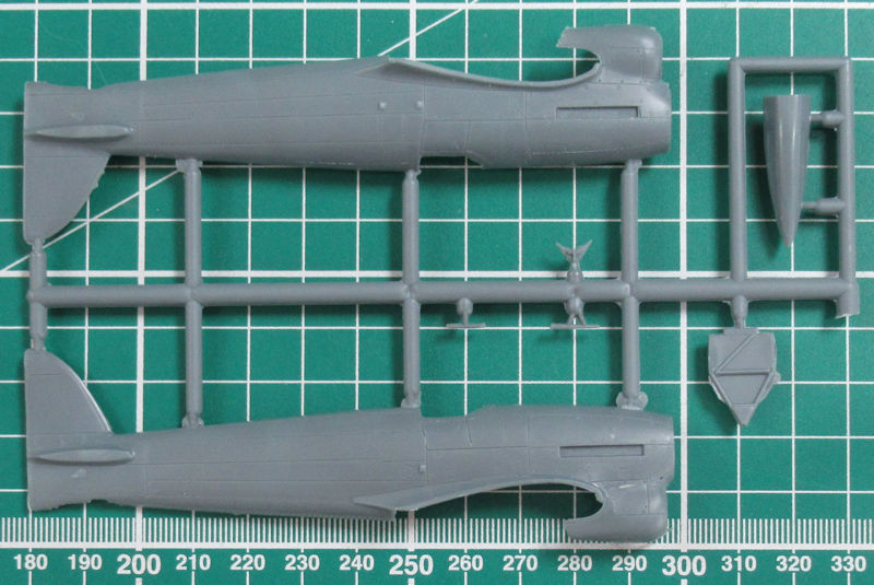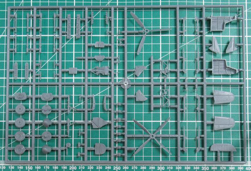 Die Drei-Blatt-Luftschraube ist einteilig. Für die Traglächenunterseite gibt es acht Waffenstationen samt Raketen. Diese werden für diese Variante nicht benötigt und somit geht die Bauanleitung auch nicht weiter darauf ein. Die beiden Landescheinwerfer sind mittels Klarsichtteilen dargestellt. Der Bausatz bietet keine Option die Tür für den Piloten offen zu montieren. Es gibt übrigens auch eine Schiebehaube für die späte Typhoon.