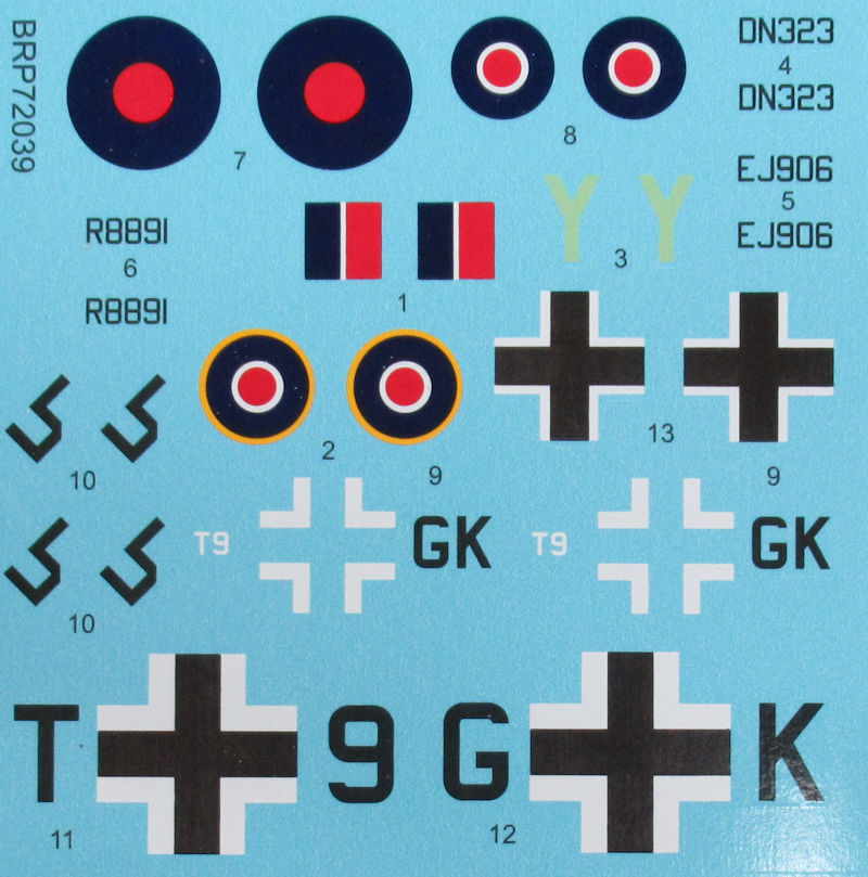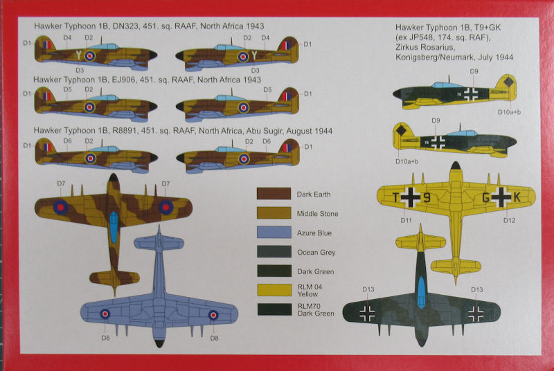 Die Farbangaben sind verbal auf Englisch. Für die deutsche Typhoon gibt es auch RLM-Farbtöne. Der Decalbogen ist tadellos gedruckt.