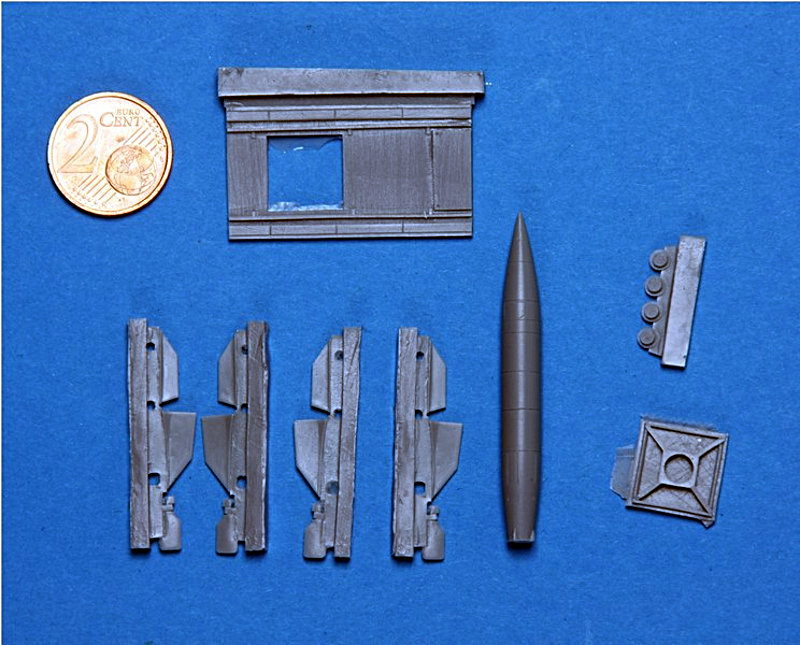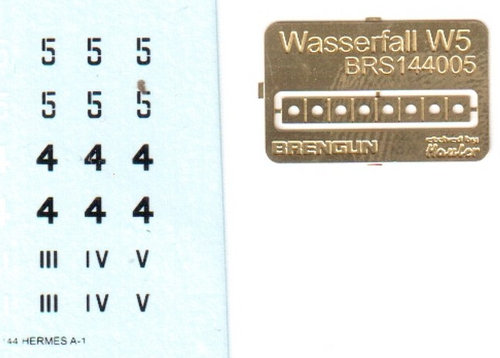 Modell: Unter der Nummer 144005 hat Brengun bereits einige Zeit die Wasserfall W5 im Programm. Nun hat man die Hermes A1 auf den Markt gebracht, wobei der Unterschied m.E. nur in den Decals liegt. Dennoch wollen wir hier mal den kleinen Bausatz vorstellen. Dieser besteht aus 19 sehr sauber gegossenen Resinteilen sowie einer kleinen Ätzteileplatine mit einem Teil, welches in dem Startwagen zur Anwendung kommt. Insgesamt besteht der Kit aus der Rakete, Startwagen und der Plattform, sodass die Präsentation des fertigen Modells vorbildgerecht startfertig erfolgen kann. Das fertige Modell wird etwa fünf cm groß sein.
