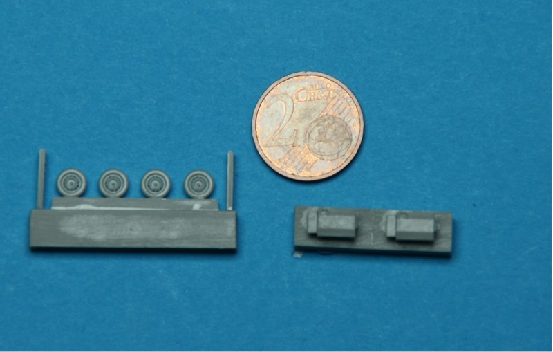 Am Ende entstehen daraus zwei kleine Start Carts. Der Guss der einteilig gegossenen Wagen sowie der Räder ist tadellos, zum Entfernen vom Gussriegel empfiehlt sich der Einsatz einer feinen Säge. Die Felgen verfügen über durchbrochene Öffnungen, was für die Feinheit der Teile spricht.