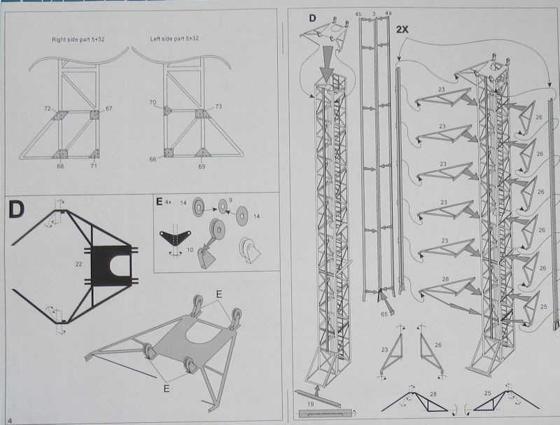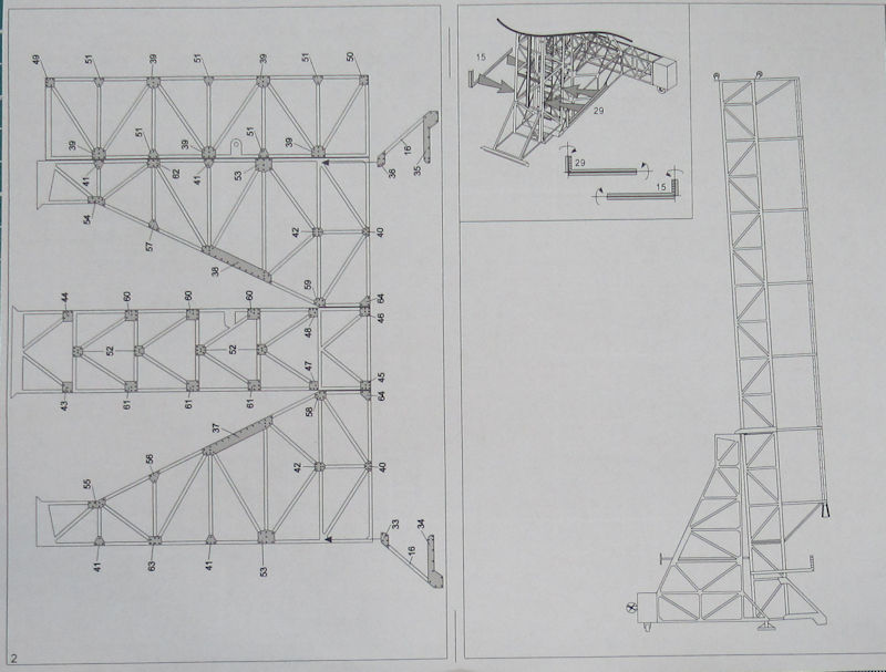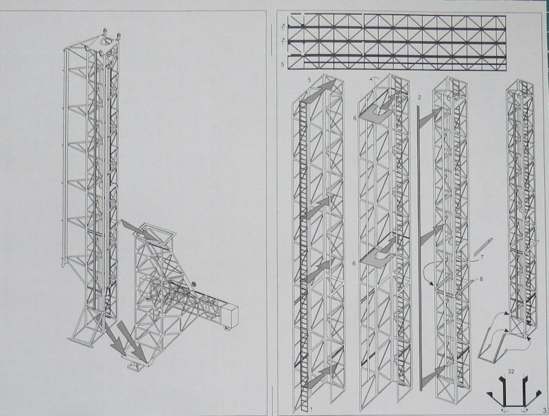 Auf acht A5-Seiten wird gezeigt wie dieser Startturm zusammengefügt wird. Ein paar Streben aus Rundmaterial müssen noch selbst angefertigt werden. Allerdings gibt es keinerlei Hinweise zur Bemalung des Startturms. Hier muss man selbst tätig werden und die vorhandenen Schwarz-Weiß-Fotos selbst interpretieren.