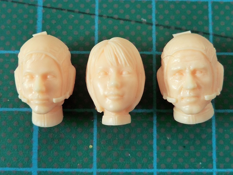 Die drei Köpfe sind extrem gut modelliert, mit hohem Wiedererkennungwert der Personen und feinen Details. Möchte man sie mit dem Rumpf von Nr.19 verbinden, sollte beachtet werden, dass entweder der am Kopf mit angegossene Kragen zu kürzen ist oder der Ansatz am Körper weiter aufgebohrt werden muß. Unterlässt man dies, bekommt die fertige Figur einen Giraffenhals, da der Kragen der Einzelköpfe fast doppelt so lang modelliert ist wie der ursprüngliche des Bodies von Nr.19. Den langen Hals benötigt man nur, wenn diese Köpfe in die Kampfanzüge geklebt werden sollen.