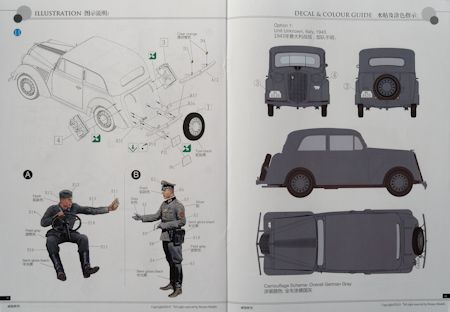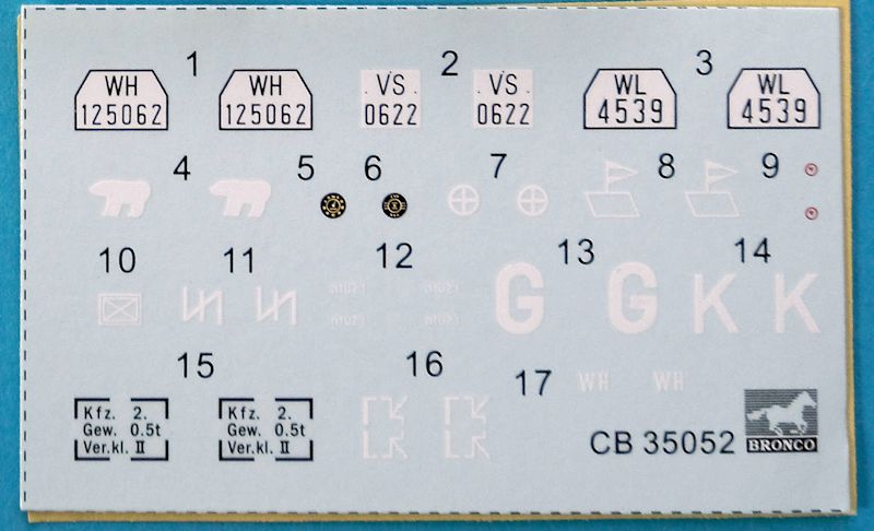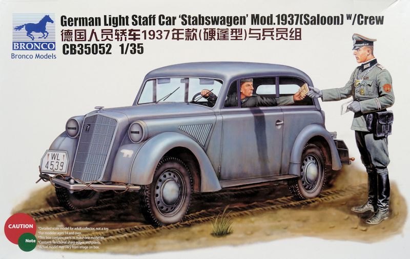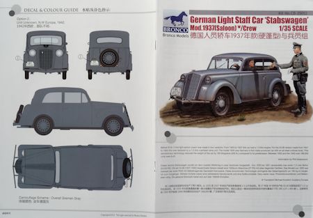 Bausatz: Bronco lässt der zivilen Ausführung (CB 35054) und dem Cabrio (CB 35047) nun die Limousine mit zwei Figuren folgen. Der Karton enthält fünf sandfarbene und fünf schwarze Spritzlinge für den PKW, einen grünen mit Benzinkanistern und einen grauen für die Figuren eines Fahrers und Offiziers. Des Weiteren gibt es einen kleinen Abziehbilder- und einen Fotoätzbogen.