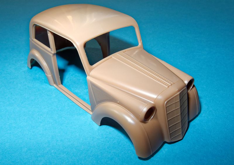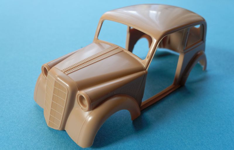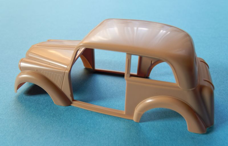 Die Qualität der einzelnen Bauteile und auch die Passgenauigkeit ist, typisch Bronco, hervorragend. Die beiden Türen bestehen aus separaten Außen- und Innenteilen und können somit auch geöffnet dargestellt werden. Aufgrund des schön detaillierten Innenraumes bietet sich diese Version sogar an. Der Motor ist hier zwar nur von der Unterseite mit Ölwanne und Getriebe an den Rahmen angedeutet, was durch die geschlossene Motorhaube jedoch nicht als Manko zu werten ist.