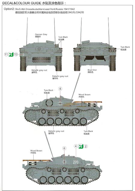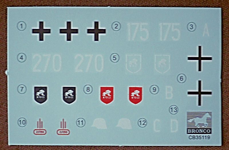 Bemalung: Die sechszehnseitige Bauanleitung ist klar und übersichtlich aufgebaut, führt durch 17 Bauabschnitte. Bei den Farben bezieht sich Bronco auf Hobby Color, Mr. Color, Humbrol und Tamiya. Der versatzfrei und sauber gedruckte Abziehbilderbogen lässt zwei verschiedene Varianten zu: