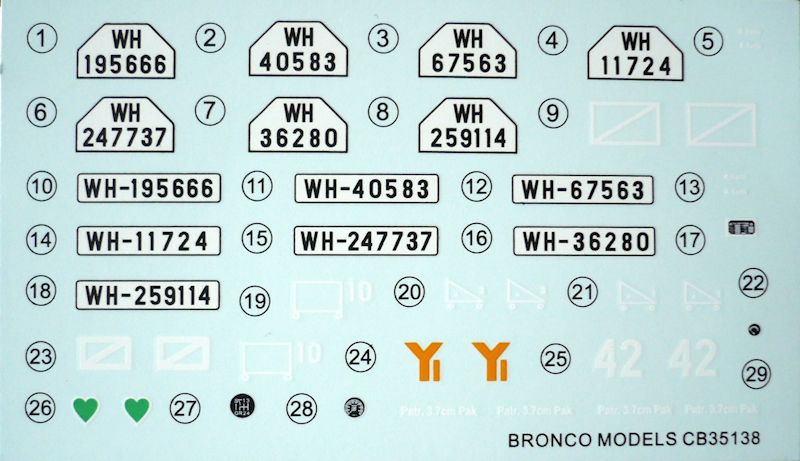 Bausatz: Mit einem Erscheinen der Krupp Protze in einer späten Version war kaum zu rechnen. Nachdem Bronco das Krupp-Fahrzeug in den wichtigsten Abarten auf den Markt brachte ist es umso erfreulicher wenn tiefer in die Materie gestoßen wird. Im Jahre 2017 erschien erstmalig die Krupp Protze in der frühen Version, in diesem Jahr die späte Version. Die hauptsächlichen Unterschiede zu früh und spät finden sich bei dem Aufbau. Mit diesen überschaubaren Veränderungen ist wieder ein neuer erstklassiger Bausatz entstanden.