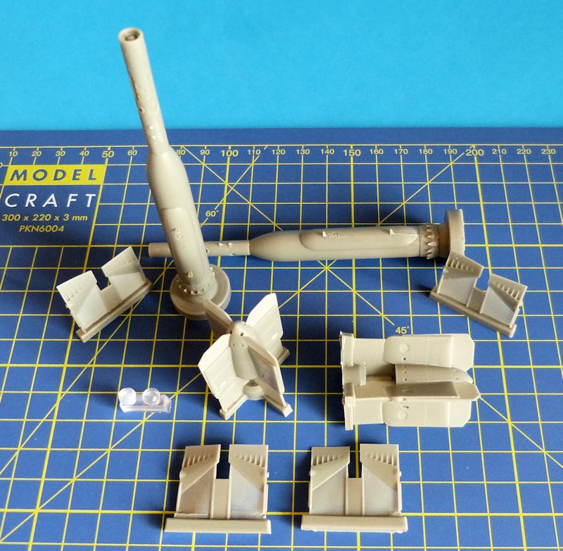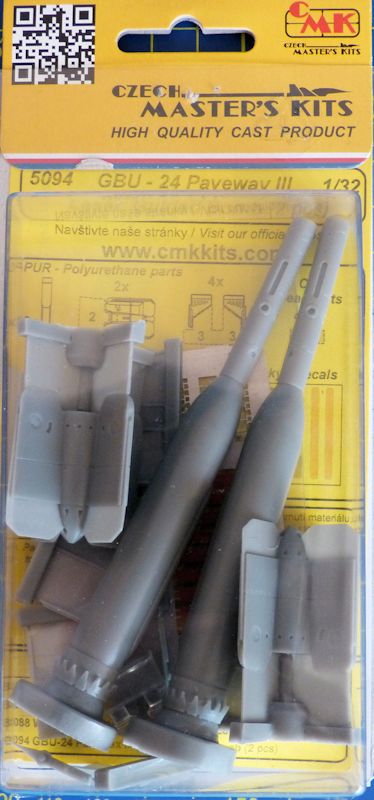 Bausatz: Der Inhalt der CMK typischen Aufschiebebox besteht aus zwei gut detaillierten Bombenkörpern, separat gibt es den Heckbereich der Paveway III und die Stabilisatoren für den Bugbereich der Bombe. Von jedem dieser Resinbauteile müssen Angüsse entfernt werden. Desweiteren befinden sich zwei Klarsichtteile für die Laserzieloptik der Paveway III Bombe in der Box.