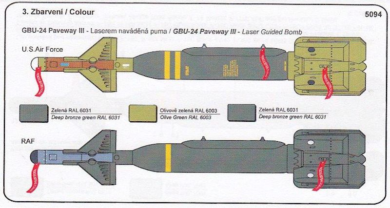Der bei meinen Bausatz fehlende Decalbogen erlaubt den Bau einer US Air Force, US Navy oder einer Paveway III Variante der Royal Air Force. Farbangaben finden sich auf einer doppelseitigen Bemalungsanleitung, mit Farbangaben in RAL. Ein kleiner Ätzteilbogen mit Remove Before Flight Fähnchen mit weißer und schwarzer Schrift, werten die Bomben noch um ein weiteres auf.