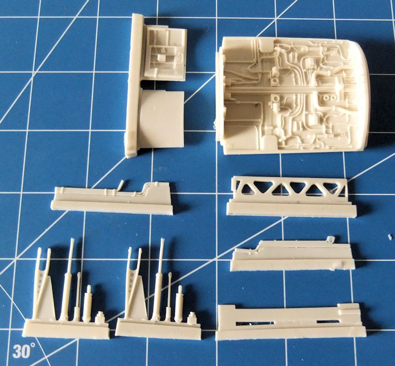 Auch diese hochwertigen Kunstharzteile werden in der bekannten kleinen Klarsichtbox mit einer guten Bauanleitung angeboten. Es handelt sich bei diesem Bausatz um Teile für den Fahrwerksbereich. Die Abgüsse sind hervorragend, und besonders im Fahrwerksschacht mit vielen Details versehen. Die Kabel sind extra gestaltet.