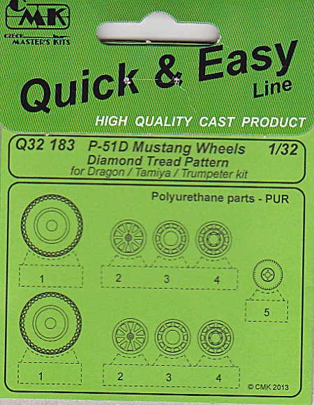 Wer mit den Gummireifen der Bausätze der 1:32 Mustang von Tamiya, Dragon und Trumpeter nicht zufrieden ist, kann jetzt auf den Radsatz von CMK zurückgreifen. Das Diamantprofil ist schön herausgearbeitet und die Reifen sind mit den Schriftzug des Reifenherstellers versehen. Leider wurden die Reifen unbelastet dargestellt. Auch das Spornrad ist beigegeben worden. Verschiedene Felgeneinsätze liegen bei. Das Resin ist blasenfrei gegossen.