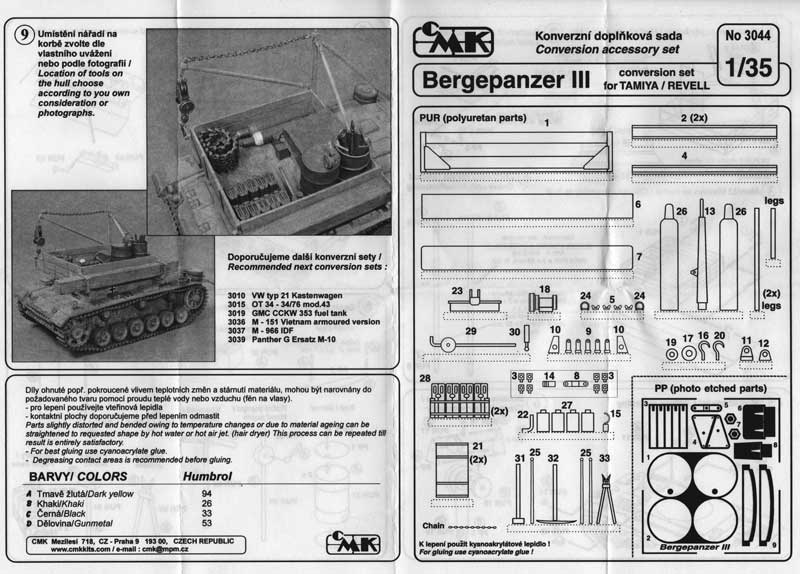 Netter kleiner Umbausatz zur Darstellung eines eher seltener auf Fotos anzutreffenden Fahrzeuges der ehem. Deutschen Wehrmacht. Die Resinteile sind sauber und (fast) ohne Fischhaut gegossen. Die beiden "Bergebalken" (1 x rund, 1 x quadratisch) sind leider etwas krumm geraten. Die Teile des Bausatzes sind fein detailiert und haben bis auf die drei grössten Teile minimale Angussstellen.