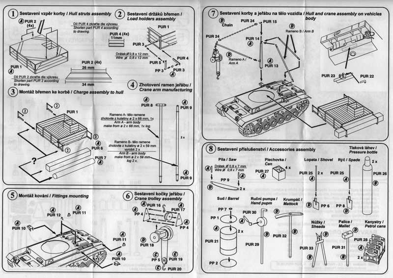 Abgesehen von dieser Herausforderung und einigen wirklichen "Kleinteilen" birgt der Bausatz keine unangenehmen überaschungen. In insgesamt 8(9) Bauabschnitten wird relativ übersichtlich der jeweilige Bauabschnitt erklärt. Die Farb-/Bemalungsangaben zu den Teilen in den Bauabschnitten kann man leider schnell übersehen. Im 9. Abschnitt sind nur zwei Schwarz-Weiss Aufnahmen mit Platzierungsvorschlägen für die restliche Ausrüstung zu sehen.