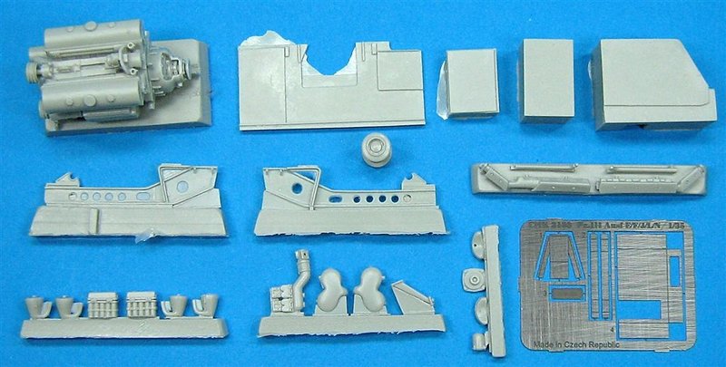 Das hier vorgestellte Set beinhaltet 25 sauber und blasenfrei gefertigte Resin-Bauteile, eine Ätzteilplatine und die Einbauanleitung. Der neue Ergänzungssatz ist für den hinteren Innenraum Bereich (Motorraum) des Panzers III gedacht. Es werden mit ihm alle fehlenden Komponenten des Plastik-Bausatzes wie der komplette Motor, die Feuerschutzwand zum Motor, Motorträger, Versorgungsleitungen, Luftfilter und der Kraftstofftank sinnvoll ergänzt.