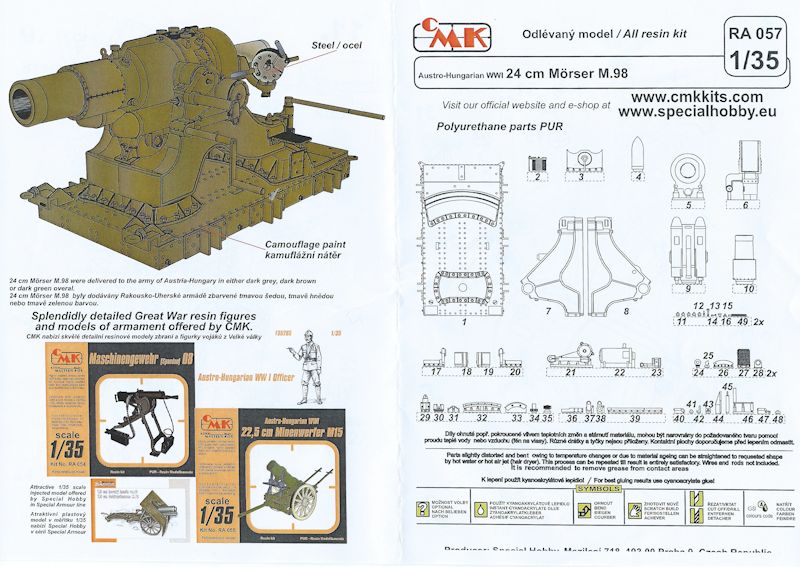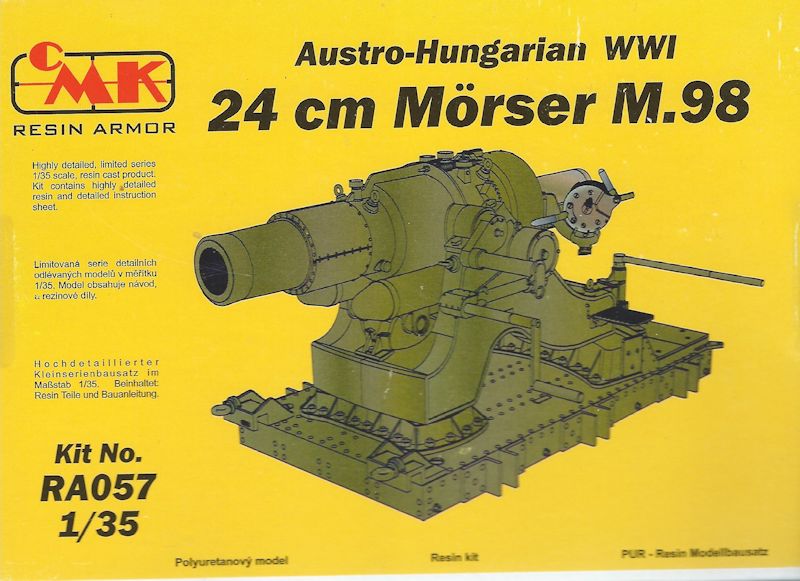 Bausatz: CMK bietet auch hochdetaillierte Resin Bausätze an und hat sich in dieser Reihe auch schweren Geschützen des ersten Weltkrieges angenommen. Unter der Bezeichnung 24cm Mörser M.98 kann man eine der beiden Varianten mit dem Zwei-Drittel Mantelrohr bis ins kleinste Detail nachbauen.