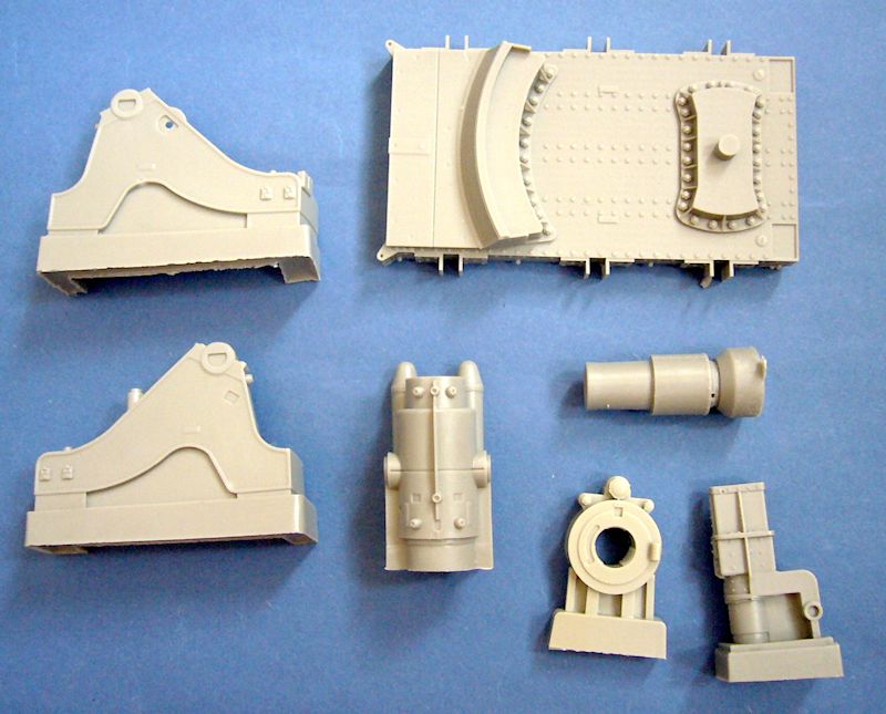 Im üblichen dicken Karton findet man sauber in Klarsichtfolie eingeschweißt alle 48 in hellgrauem Resin abgeformten Teile. Neben großen Platten und Geschützteilen sind auch kleinste Hebel sowie eine Granate mit dem entsprechenden Ladearm enthalten. Alle Teile sind Luftblasen frei und höchst genau wieder gegeben und weisen auf exakte Recherchen hin.