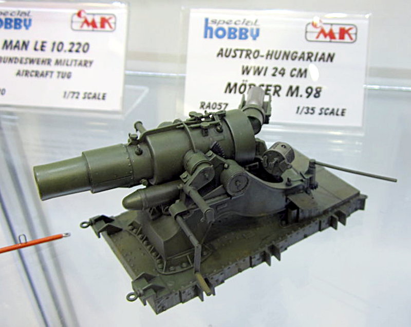 Vorbild: Der 24-cm-M.98-Mörser in den Ausführungen M 98 und M 98/07 war bis zur Einführung des 30,5-cm-M.11-Mörsers im Jahre 1911 das schwerste Geschütz im Bestand der k.u.k. Festungsartillerie. Noch zu Friedenszeiten eingeführt, bewährte sich der Mörser M 98 bereits 1902 auf dem Artillerie-Schießplatz und Versuchsgelände in Felixdorf. Mit dem Gerät wurden Beschussversuche zur Gewinnung neuer Erkenntnisse auf dem Gebiet des Festungsbaus durchgeführt. Obwohl der 30,5-cm-Mörser als Ersatz vorgesehen war, befanden sich 1914 bei Kriegsbeginn noch vierzehn dieser Mörser im aktiven Dienst. Wie zahlreiche andere Geschütze der k.u.k. Armee wurde auch dieser Mörser von Škoda entwickelt und hergestellt.