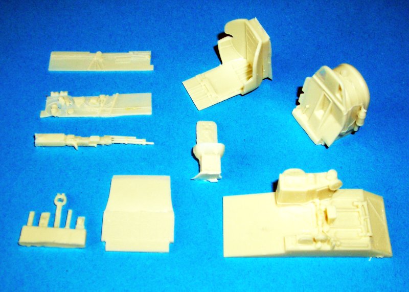 Das "interior set" befasst sich naturgemäß hauptsächlich mit dem Besatzungsraum für Piloten und Bordschützen. In bekannter Manier aus Resin- und Ätzteilen bestehend, sorgt der Satz für einen ordentlichen Detaillierungs schub, allerdings auch für erhebliche Mehrarbeit. Die tiefgezogene Kabinenhaube ist natürlich etwas dünner als das Bausatzteil, erfordert aber auch spezielle Techniken der Verarbeitung und is nach meiner Meinung nicht besonders gut geraten, die Konturen sind etwas unscharf und die Klarheit/Durchsichtigkeit ist ebenfalls nicht optimal. Ich werde wohl die Schiebehauben mit den feststehenden Teilen aus dem Bausatz kombinieren.