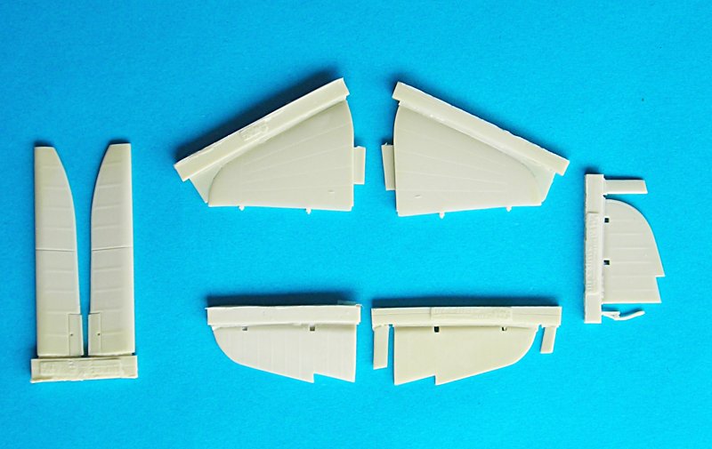 Der Steuerflächensatz enthält genau das, was der Name verspricht. Die Höhenruder liegen als Ruderfinne und Steuerflächen bei und ersetzen die Bausatzteile. Die Trimmruder sind ebenfalls separat gehalten. Ebenso beim Seitenruder. Hier ist jedoch sinnvollerweise nur die Steuerfläche im Satz enthalten. Man muss also das Ruder aussägen, was aber die wenigsten Modellbauer, die einen solchen Satz benutzen wollen, vor ein Problem stellen dürfte. Sehr schön finde ich den Separat beiliegenden Hornausgleich, den man ganz zum Schluss anbringen und somit ettliche Brüche und Flüche vermeiden kann. Auch die Querruder des Bausatzes müssen ausgesägt und durch Resinteile ersetzt werden.