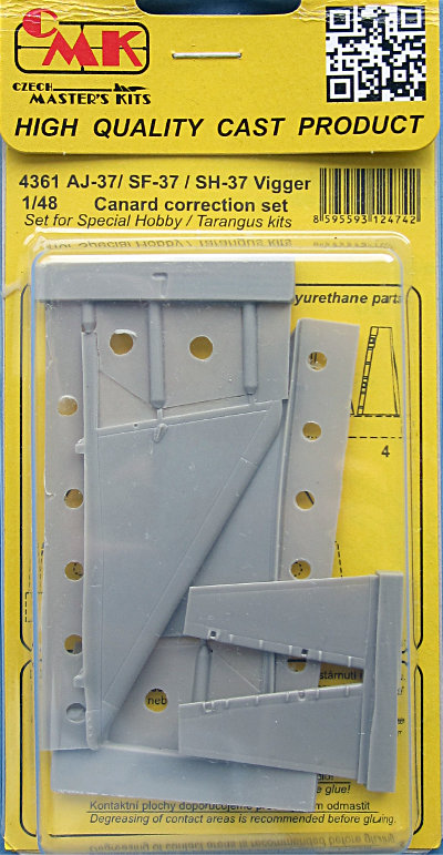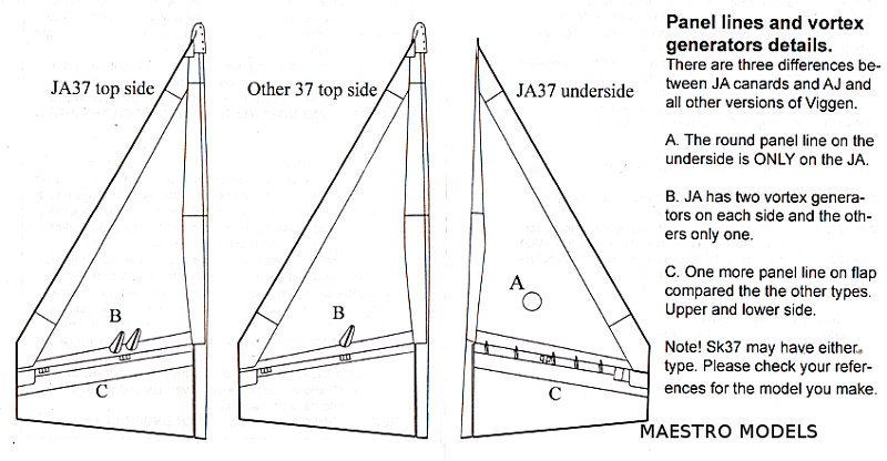 Für die von Special Hobby und Tarangus herausgebrachten Bausätze der AJ-37 Viggen, AJS-37 Viggen und andere Jabo und Aufklärervarianten hat CMK dieses Korrekturset im Angebot. Das Problem des Grundbausatzes sind einige Vereinfachungen. Dazu gehören neben dem nicht dargestellten automatisch ausfahrenden Generator auch die Canard-Ruder, welche mit ausfahren des Fahrwerks um 30 Grad abgesenkt werden. Maestro Models hat bereits einen universellen Korrektursatz für diese Viggen-Bausätze herausgebracht. Unter dem Labe CMK erscheinen nun jeweils ein Set für die Jagdvariante und hier die übrigen Baureihen. (siehe Zeichnung unten aus dem Maestro Satz K4895).