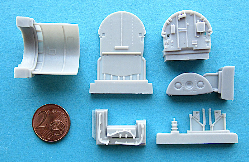 Der CMK Satz enthält 12 Teile einschließlich der Verkleidung im typischen CMK-Resin. Wie immer empfehle ich den Einsatz einer sehr dünnen Modellbausäge für das Abtrennen der Angüsse (z.B. Hypercut Saw). Ebenso muss man zum Einbau des Satzes vom Rumpf einige Paneele abtrennen, auch hierfür empfehle ich Rasierklingen- oder Fotoätzteilsäge bzw. das genannte Produkt. Wo zu sägen ist, zeigt die Bauanleitung.