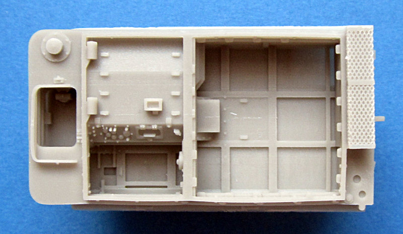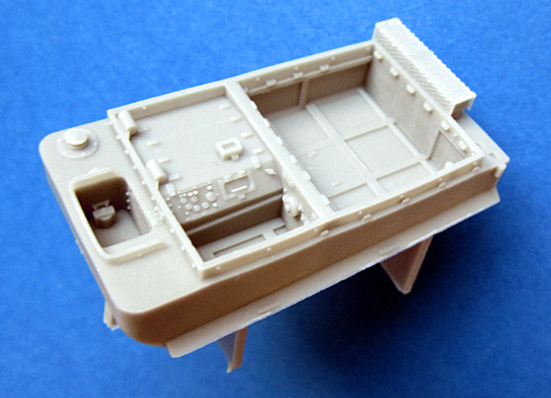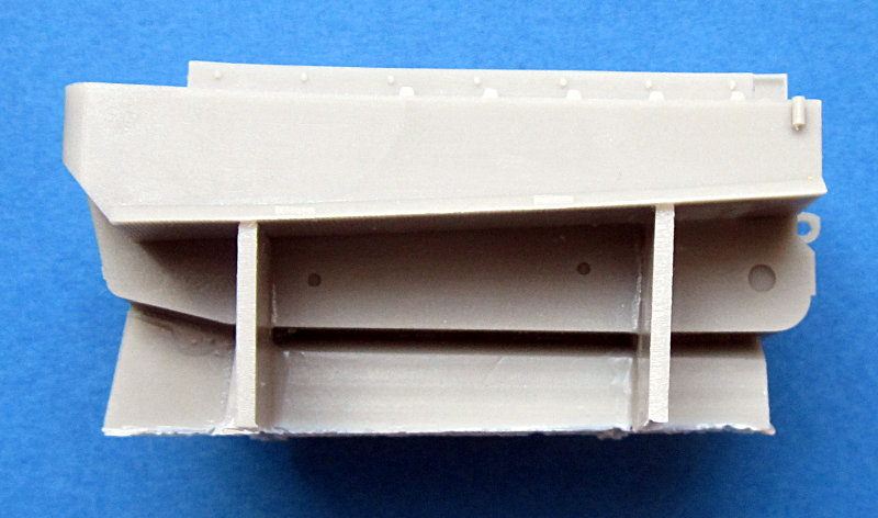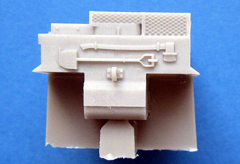 Bausatz: Dies ist einer der ersten Bausätze von CMK bei dem der 3D Druck für das Prototyping genutzt wurde. Daraus resultieren sehr wenige, aber komplex geformte Teile. Da man im Hause CMK sehr viel Erfahrung mit dem Gießen von Resinteilen hat, ist man hier offensichtlich den gerade machbaren Kompromiss eingegangen. Die Hauptbaugruppe hat allerdings einen ziemlich großen Anguss, den man mittels Modellbausäge entfernen muss. Ich nehme für solche Arbeiten gern die Thin Blade Craft Saw von Tamiya, aber jeder hat dafür sicher sein präferiertes Werkzeug. Während des Schleifens sollte man auf jeden Fall einen Atemschutz tragen.