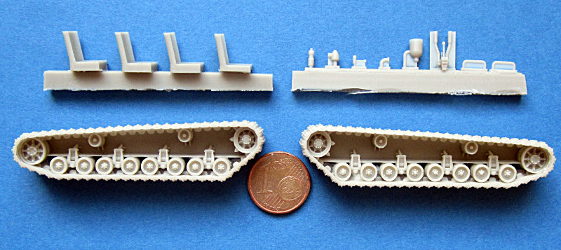 Auch die Ketten mit Rollen sind jeweils einteilig gegossen. Hier muss man vorsichtig die Gusshaut entfernen, damit ein vorbildgerechter Eindruck entsteht. Dabei muss man sehr aufpassen, um die filigrane Aufhängung der Laufrollen nicht zu beschädigen (wie ich es leider getan habe). Insgesamt ist der Bau jedoch sehr einfach. Es gibt nur wenige Teile und die kleine 3stufige Bauanleitung ist völlig ausreichend. Die wenigen Fotoätzteile benötigt man für den Schutzbügel vor der Winschutzscheibe und für den Rahmen dieser Scheibe selbst. Als Glasimitat wird ein Fotofilm verbaut.
