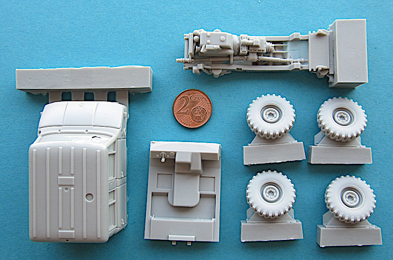 Weitaus detaillierter ist der Rahmen mit Motor und Getriebe und das obwohl auch dies nur ein Teil ist! Hieran werden die beiden Achsen mit Antriebswellen, vordere Kotflügel, und Heckplatte montiert. Auch eine Nachbildung der Lenkung ist vorgesehen (darstellbar ist aber nur der Geradeauslauf). Die Räder sollen auch bereits in dieser Phase angebaut werden. Auf dieses Grundgerüst wird die Führerhausbodengruppe aufgesetzt und das Heck mit Ballast angeklebt. Seitlich werden die Trittbretter mit verschiedenen Behältern und vorn die Frontplatte mit Schleppkupplung montiert. Abschließend findet die Hochzeit zwischen Kabine und Fahrgestell statt und Spiegel, Scheibenwischer und Scheinwerfer werden montiert.