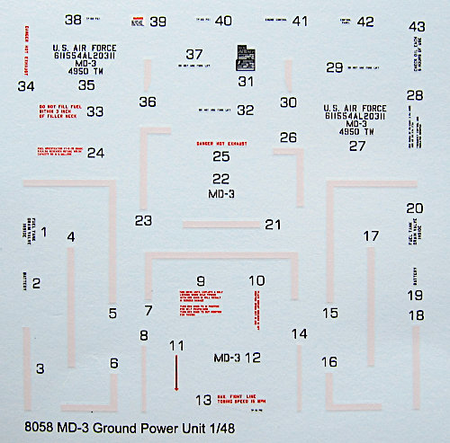 Mit den beiliegenden Decals kann ein Wagen der USAF dargestellt werden. Es wird auf die Farbsysteme von Gunze und AK verwiesen, aber gelb und rot dürfte sich bei jedem Modellbauer finden lassen. Die Decals sind sauber und scharf gedruckt.