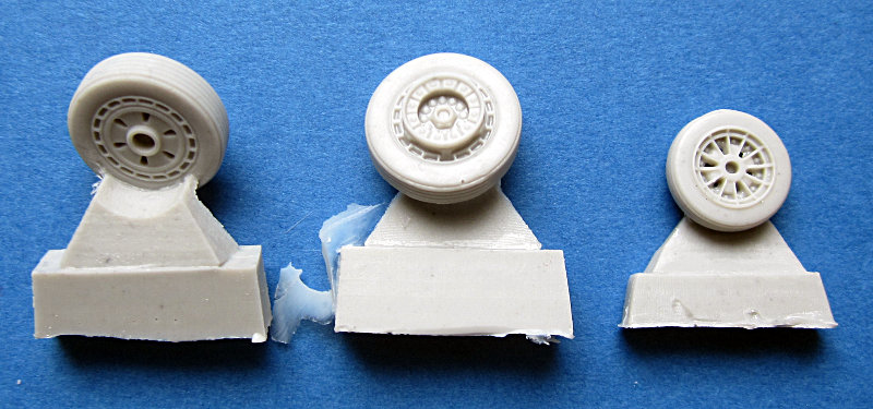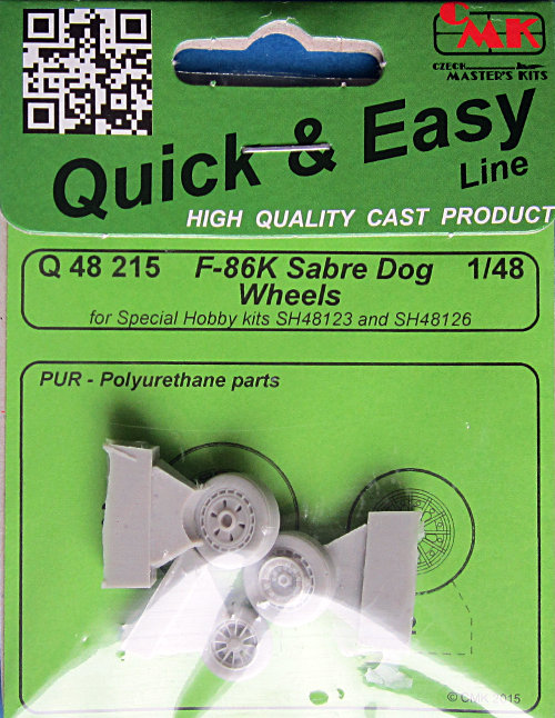 CMK hat in seiner Reihe von Zurüstteilen Resin-Räder für die hauseigene North-American F-86K Sabre Dog (First Look) herausgebracht. In der Kunststofftüte auf dem Pappblister finden sich zwei Hauptfahrwerksräder und und das Bugrad aus Resin. Die Räder sind mit einem Rillen-Profil versehen und nicht abgeflacht. Wie bei den neuen auf "rapid prototyping"-Mastern basierenden Sätzen üblich, findet sich der Anguss auf der Flanke der Räder, wo sich dieser recht gut entfernen lässt.
