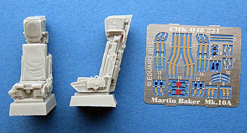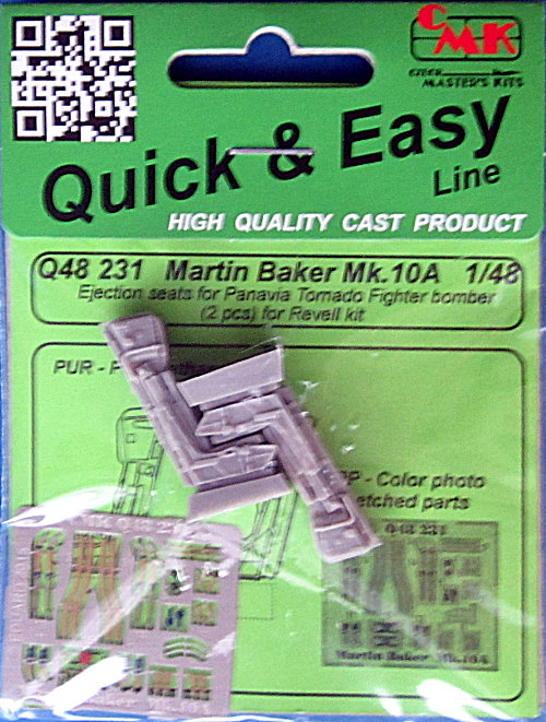 CMK hat in seiner Reihe von Zurüstteilen Marin Baker Mk.10A Schleudersitze für den Tornado von Revell (Tornado IDS, Tornado GR.4) herausgebracht. Wie immer in der Q&E Serie befindet sich die Resinteile in einer Plastiktüte mit Papprücken. Wieder gibt es einen kleinen PE-Bogen in der Verpackung für die Gurte. Letztere müssen bei diesem Satz leider separat montiert werden. Ansonsten sind die Sitze aus einem Guss und erleichtern somit den Bau des Revell Tornados. Die Sitze des Bausatzes sind zwar gut aber wegen der Einschränkungen der Spritzgusstechnologie vielteilig aufgebaut.