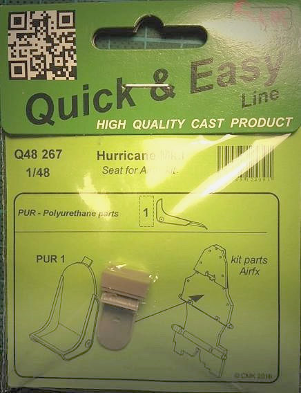Für die neue Airfix Hurricane bringt CMK aus der Tschechei mehrere Resin-Sets zur Verfeinerung heraus. Dazu gehört der Sitz als Drop-in für den an sich recht ordentlichen dreiteiligen Bausatzsitz. Wie zu erwarten erhält man eine realistischere Wandstärke der Sitzschale und eine beim Spritzgussteil fehlende Vertiefung sowie eine Öffnung in der Rückenlehne. Das Resinteil wird vom Anguss abgetrennt und einfach an Stelle des Kitteils eingebaut. Angegossene Gurte fehlen, so dass zur Ergänzung Gurte aus dem Zubehörhandel oder aus Eigenproduktion ergänzt werden sollten.