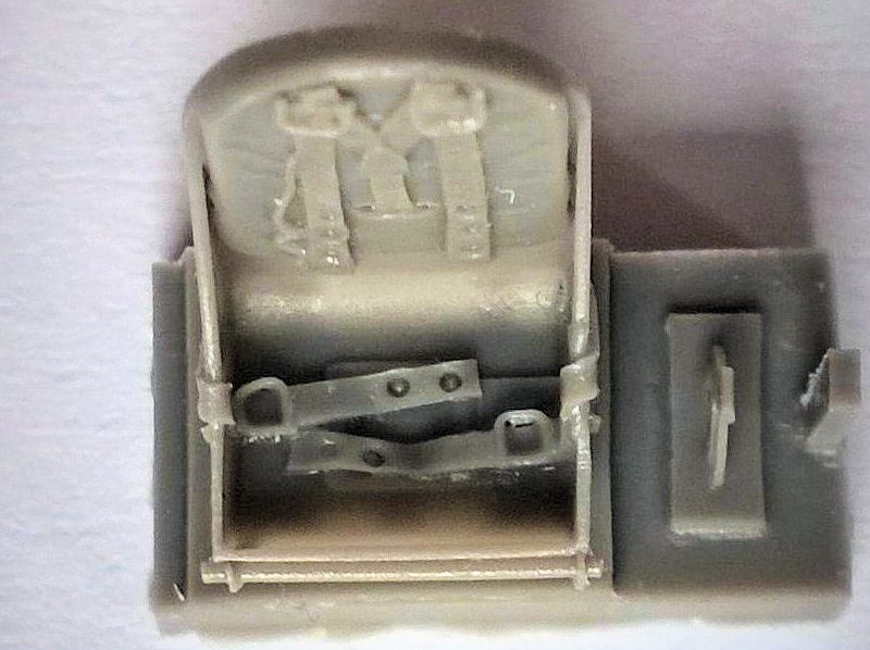 Auf dem Gussblock sind die beiden Komponenten des Sitzes zu sehen, einmal die Sitzwanne und rechts daneben ein an der Rückenlehne anzuklebendes Y-förmiges Stück des Sitzgurtes. Gut zu erkennen ist die strukturierte Polsterung der Rückenlehne, die es beim Bausatzsitz so nicht gibt.
