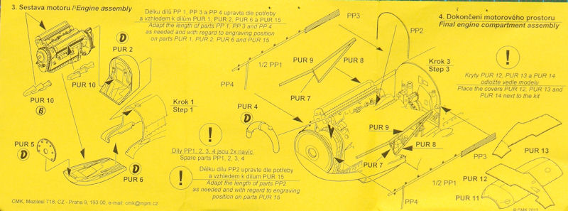 In der typische Bilster-Verpackung von CMK befinden sich 17 sauber gegossene Resinteile, ein Fotoätzteilbogen, eine Klarsichtplatte und die Bauanleitung. Um dieses Set verbauen zu können muss der gesamte Rumpfbug des Airfix-Bausatzes abgesägt werden. Der Motor bekommt noch ein paar Zündkabel sowie neue Auspuffstutzen.