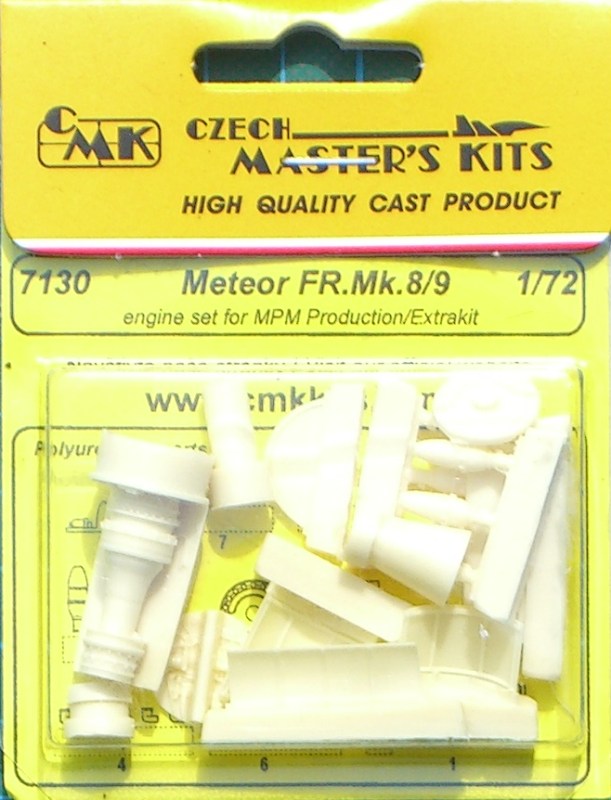 Resindetailset: Dieses Set enthält alle Teile, die für die Detaillierung eines Triebwerkes des Gloster Meteor-Bausatzes von MPM/Extrakit notwendig sind. Dafür gibt es neben dem Triebwerk, welches aus 13 Einzelteilen zusammengesetzt wird, auch noch ein paar Klappen für die Ober- und Unterseite des Triebwerks.