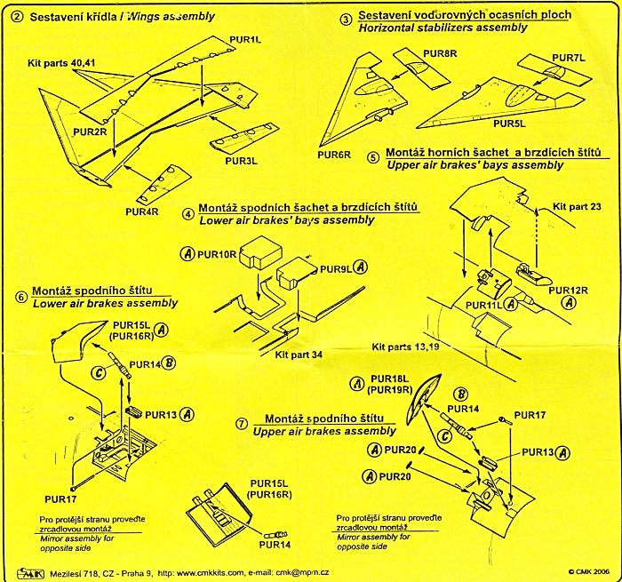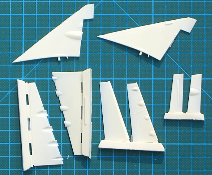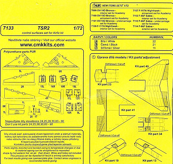 Langsam trudeln die Zubehörteile für den Airfix-Bausatz der TSR. 2 ein. Wohl dem, der immer ein wenig wartet... CMK liefert hiermit ein Set, welches folgende Bereiche besser detailliert, als es die Bausatzteile tun: komplettes neues Höhenleitwerk, Landeklappen und Luftbremsen incl. der dazugehörigen Rumpfteile. Der Guss ist bei CMK immer recht ordentlich. Vor der Verarbeitung der neuen Bauteile müssen einige Bausatzteile zurechtgeschnitten werden. Beim Anpassen geht es allerdings nicht ohne Spachtelarbeit ab. Sie ist jedoch an der Tragflächenunterseite notwendig, wo dieses sehr gut mögliche ist. Dafür gibt es dann auch separate Landeklappen, die allerdings beim Vorbild am Boden immer in neutraler Stellung waren. Selbst bei den beiden Museumsmaschinen ist es so. Das als Pendelruder ausgelegte Höhenleitwerk wird komplett ersetzt. Es kann in verschiedenen Stellungen montiert werden. Fotos dokumentieren verschiedene Stellungen. Die Luftbremsen sind bei den beiden Museumsmaschinen ausgefahren. Ansonsten war es im Stand eigentlich nicht der Fall. Betrachtet man die Detailfotos im Referenzbuch (Siehe First Look!) erkennt man den Sinn der separaten Klappen. Ein wenig größer als ein Gravurmaß war der Spalt an der Unterseite schon! Die CMK-Teile übertreffen die Bausatzteile natürlich um Längen.
