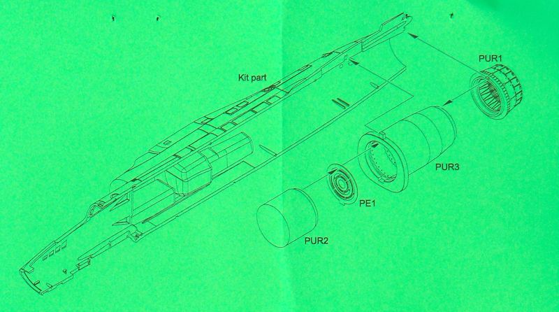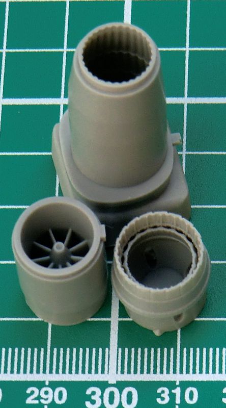Die vier Teile werden einfach zusammengeklebt und dann passend bemalt. Dann hat man innen sogar die Tubinenschaufeln und einen tollen Nachbrenner. Ohne zusätzliche Lichtquelle dürfte kaum alles zu sehen sein. Damit kommen wir auch zum Nachteil. Es gibt leider keinerlei Hinweise für die Bemalung! Man muss sich hier auf Fotos oder die Erfahrung verlassen.