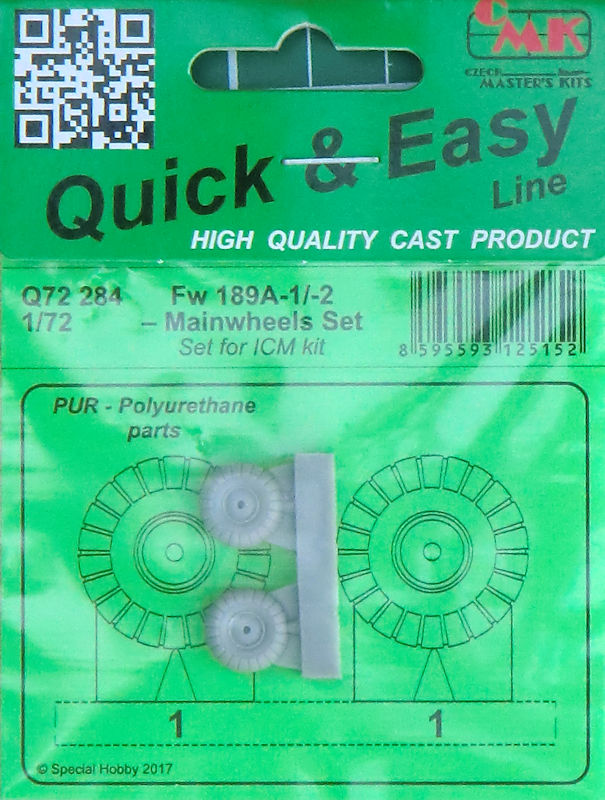 Für den aktuellen ICM-Bausatz der Focke Wulf Fw 189A-1/-2 im Maßstab 1/72 hat CMK unter dem Label Quick & Easy ein Set mit Hauptfahrwerksrädern herausgebracht.
