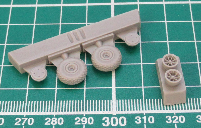 In der durchsichtigen Verpackung befinden sich sechs sauber gegossene Resinteile. Die Radkappen sind separat gegossen und so hat man die Möglichkeit diese je nach Vorbild zu montieren. In diesem Set haben die Reifen das sog. Cross-Profil. Das ist sehr schön nachgebildet. Der Unterschied zum Diamond-Profil ist aber sehr gering.