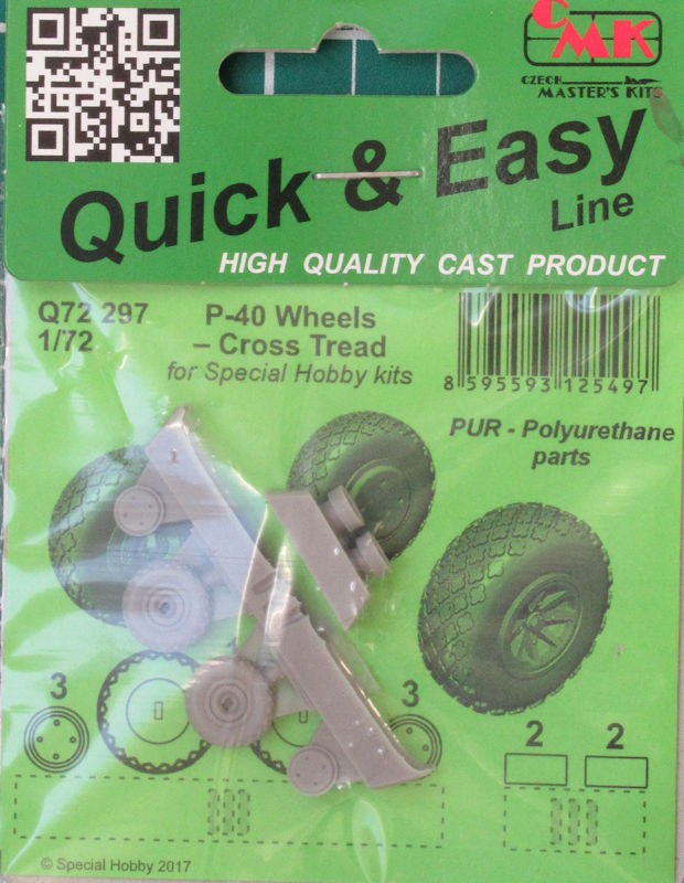 In der Reihe Quick&Easy ist bei CMK mehrere Resindetailsets für die hauseigenen(special hobby) Curtiss P-40-Bausätze in 1/72 herausgebracht. Dieses beinhaltet ein Set Hauptfahrwerksräder.