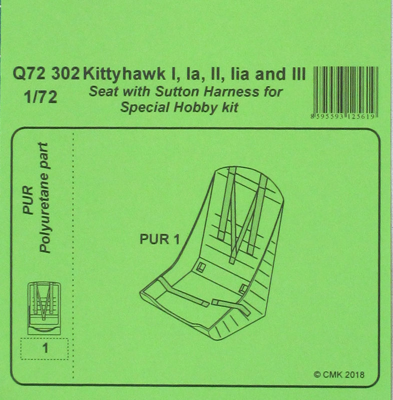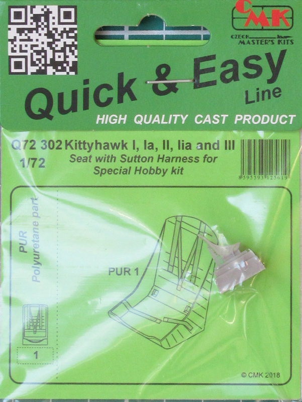 In der Reihe Quick&Easy ist bei CMK mehrere Resindetailsets für die hauseigenen(special hobby) Curtiss P-40-Bausätze in 1/72 herausgebracht. Dieses beinhaltet einen Pilotensitz für die späten Kittyhawk Mk. I / Ia / II / IIa /III. Die Unterschiede liegen in der Sitzkonstruktion und in den Gurten.