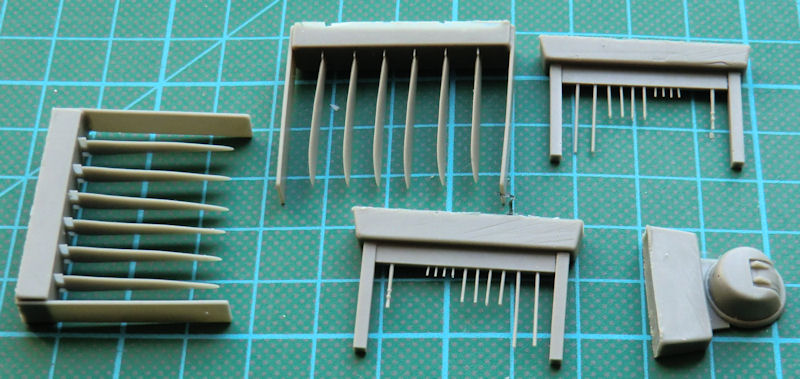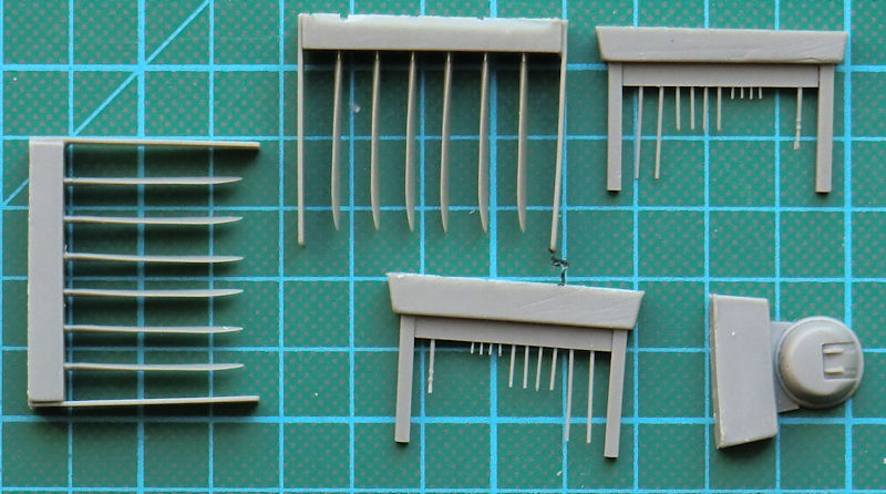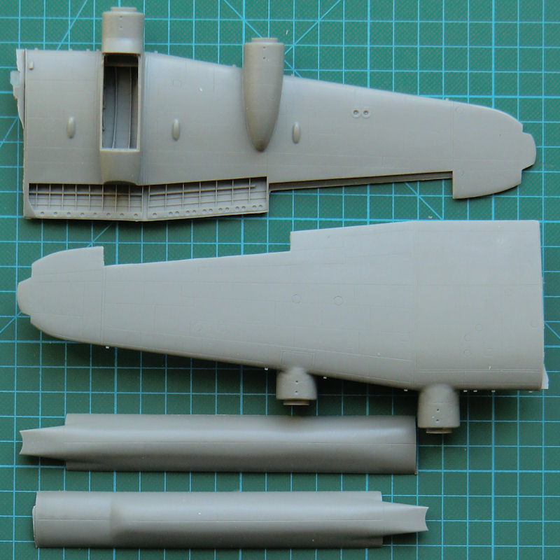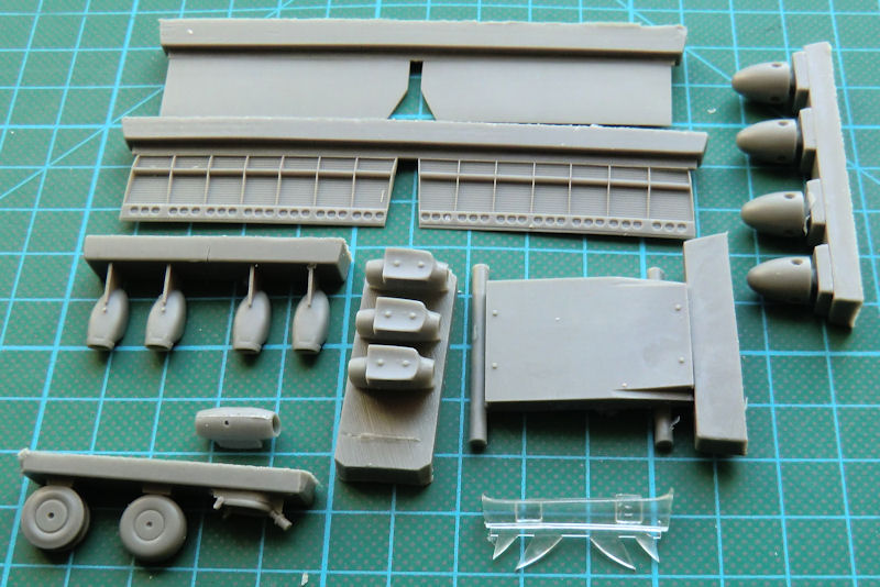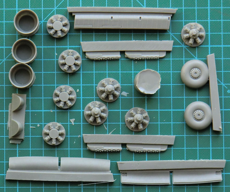 CMR hat natürlich auch neue Luftschrauben, detaillierte Motorhauben und die komplizierten Auspuffstutzen perfekt gegossen. Die Motorkühlluftklappen liefert CMR aus Fotoätzteilen. Es gibt beide Formen der Waffenschächte als Alternativteile und dazu passend den FN120-Abwehrstand. Ein paar neue Räder gibt es noch dazu. Aus schwarzem Resin liefert CMR auch gleich neue Fahrwerksteile mit dazu. Das auch neue Fahrwerksklappen mit dabei sind, das ist jetzt schon fast selbstverständlich. Auch neue Vacu-Klarsichtteile hat CMR für den Bombenschützenstand beigelegt. Es gibt die frühere kleinere und die spätere vergrößerte Ausführung alternativ.