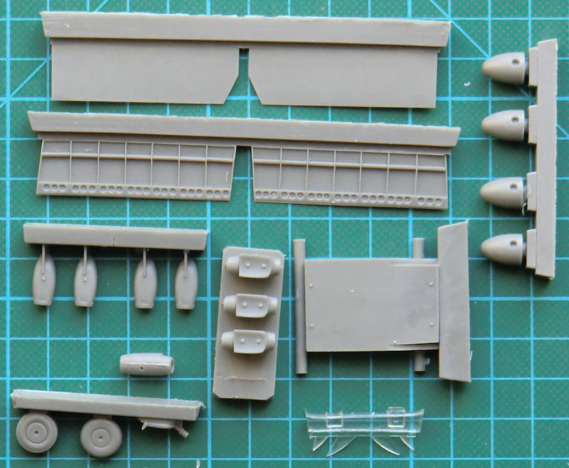 Bausatz: CMR hat hier einen interessanten Umbausatz abgeliefert. Diesen gibt es gleich für drei verschiedene Basisbausätze: Airfix, Hasegawa und Revell. Mir liegt letzterer vor. In einem stabilen Stülpkarton befinden sich gut verpackt 69 dunkelgraue Resinteile, vier klare Resinteile, vier Vacuteile, einen Bogen Fotoätzteile, eine übersichtliche Bauanleitung sowie ein Decalbogen.
