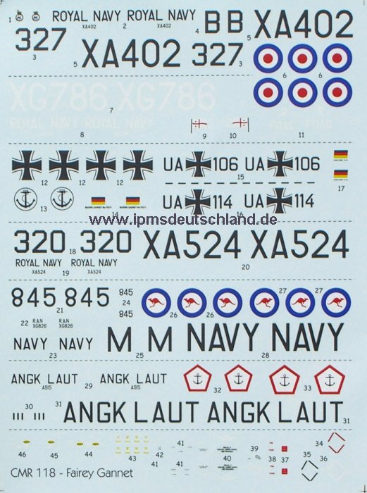 Bausatz: Die Gannet entstand bei CMR als Resinkomplettbausatz schon vor gut vier Jahren. Damals hat noch keiner an das Modell von TRUMPETER oder vielleicht auch Revell gedacht? Das Cockpit ist recht ordentlich detailliert. Nur Sitzgurte sollten noch ergänzt werden, da die Vacukanzeln recht durchsichtig sind. Immerhin enthält der Bausatz auch die Möglichkeit, eine Trainermaschine zu bauen. Die T.2 (Trainerversion der A.S.1) und die T.5 unterscheiden sich nicht äußerlich. Hier gilt es sich früh zu entscheiden. Ansonsten erwarten den Modellbauer feinste Resinteile und je nach Charge Zinnfahrwerksbeine oder welche aus hartem Resin. Alle Angüsse sind optimal gewählt und die tolle Bauanleitung lässt keine Fragen offen. Sie enthält auch wieder Vorbildmaterial. Für die Lackierung gibt es Masken, die leider aus dem alten bei eduard verwendeten Material sind. Der Decalbogen ist umfangreich und sehr gut gedruckt.