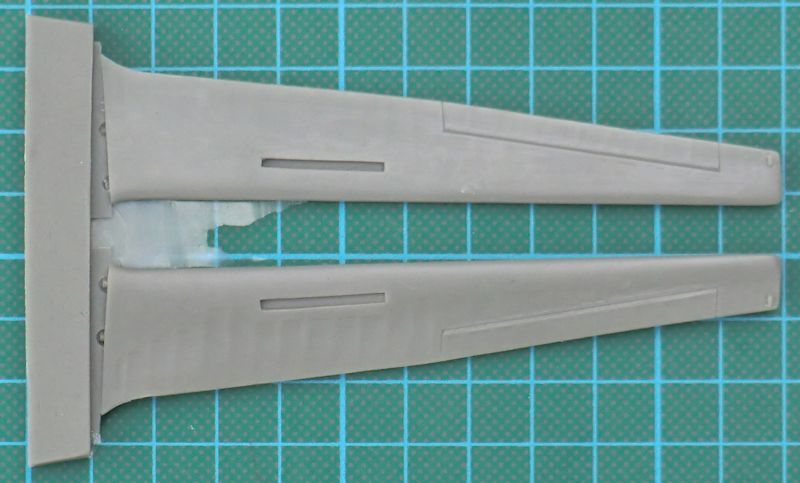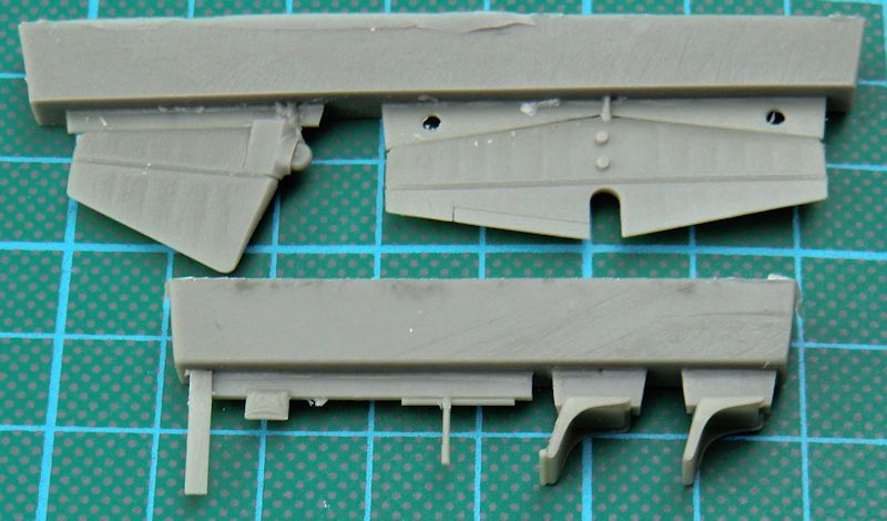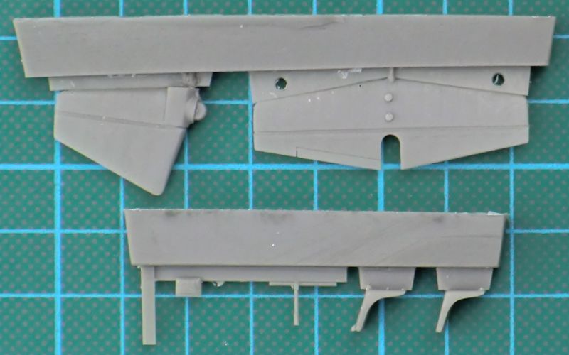 Für das Seitenleitwerk gibt es noch ein Alternativteil. Wer das verbauen möchte, der muss die Säge ansetzen. Das Höhenleitwerk besteht aus einem Stück und hat, wie alle anderen Ruder auch, eine scharfe Hinterkante. Bei den Tragflächen hat man die mit Stoff bespannte Bereiche wunderbar nachgebildet. Die aus Fotoätzteilen zu erstellenden Landeklappen können aus- oder eingefahren nachgebaut werden. Ersteres ist im Stand am Boden meistens der Fall. Die Vacukanzel ist doppelt vorhanden.